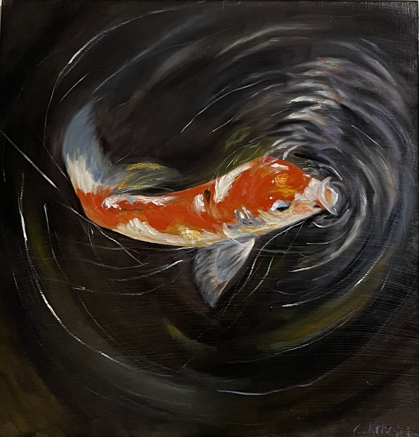 Sweet fun single koi fish oil painting on 12×12 canvas wood board. Easy to hang no framing needed.