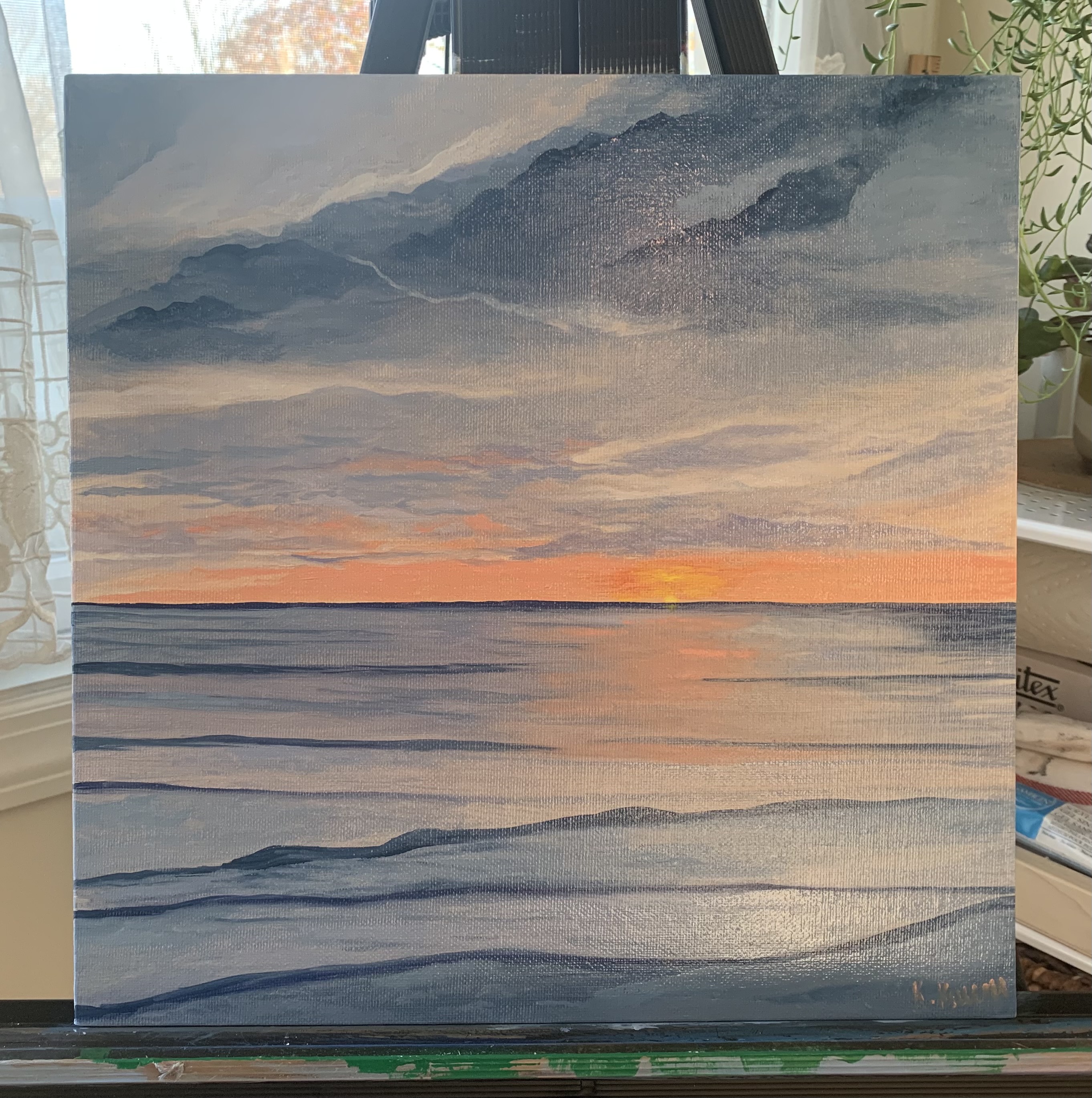 This beach scene is taken at St. Pete beach in Florida. I love the subtle cool and warm colors in this painting. I enjoyed painting this so much and makes me miss the beach every time I look at it. Done in oil paints and easy to hang and light weight.